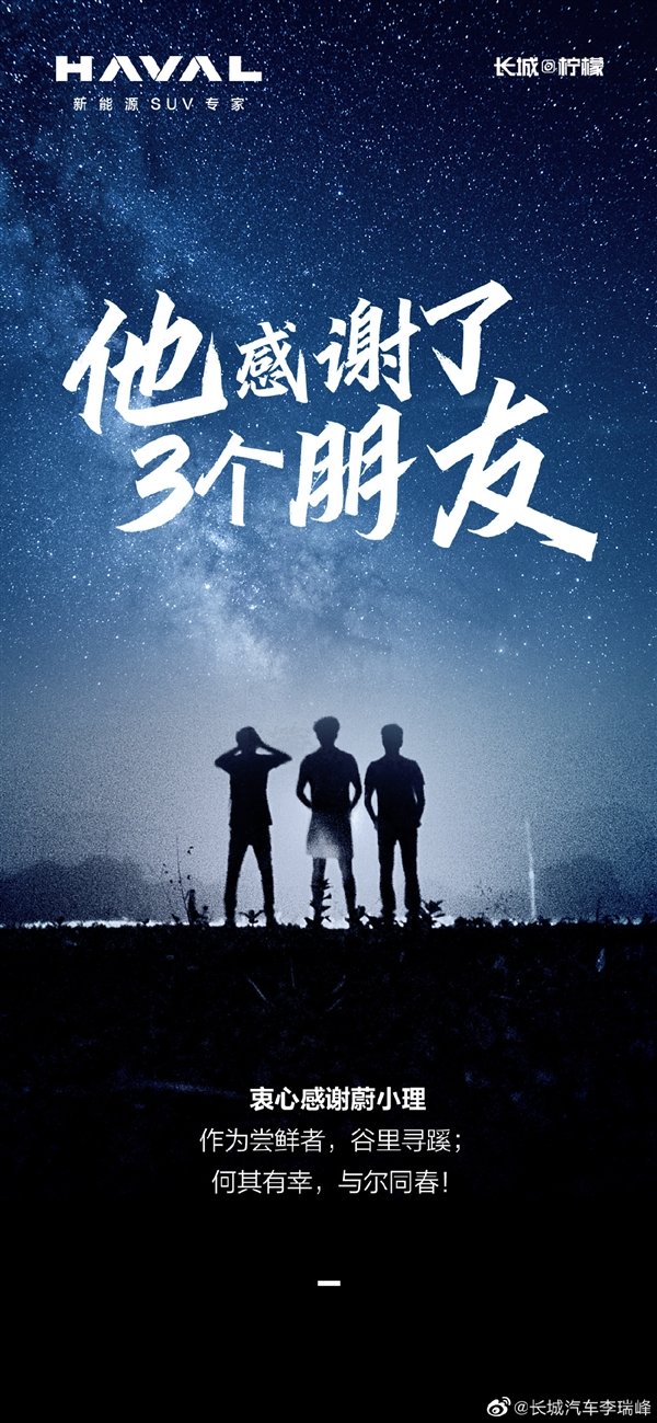 在发布会之后,长城汽车CGO(首席增长官)李瑞峰还在微博发布了四张海报,隔空喊话了蔚小理和比亚迪:“衷心感谢蔚小理,作为尝鲜者,谷里寻蹊,何其有幸,与尔同春!”
