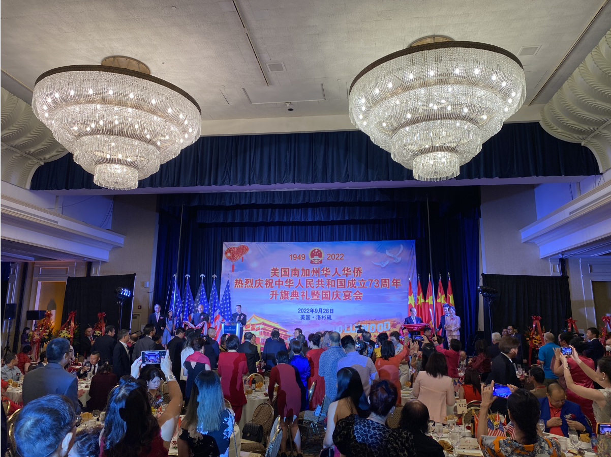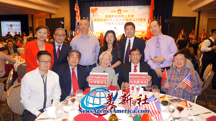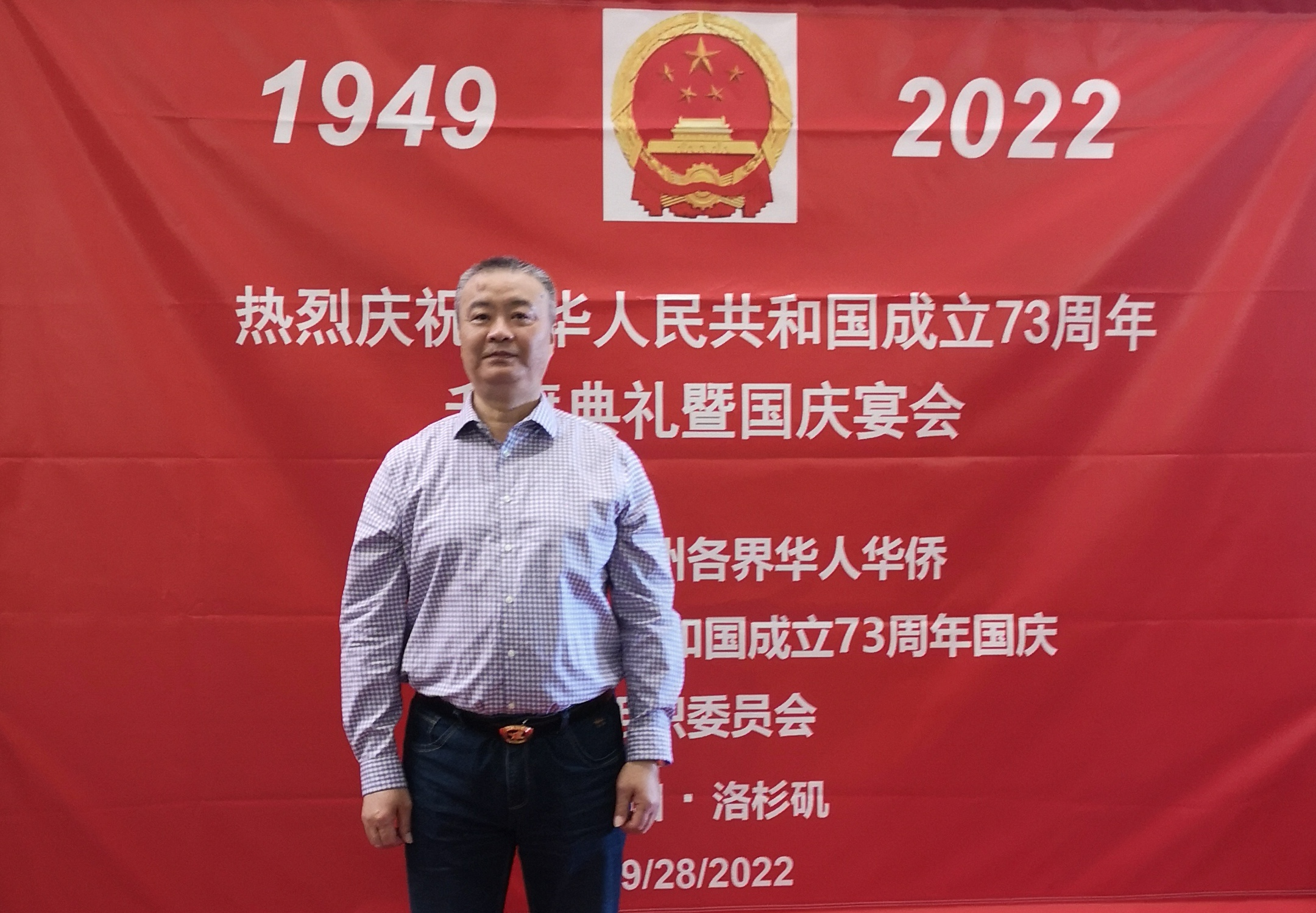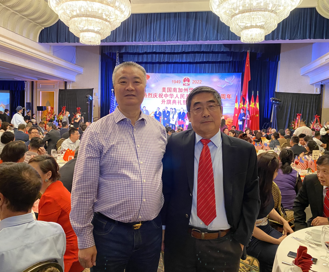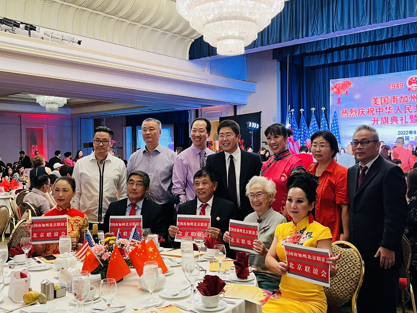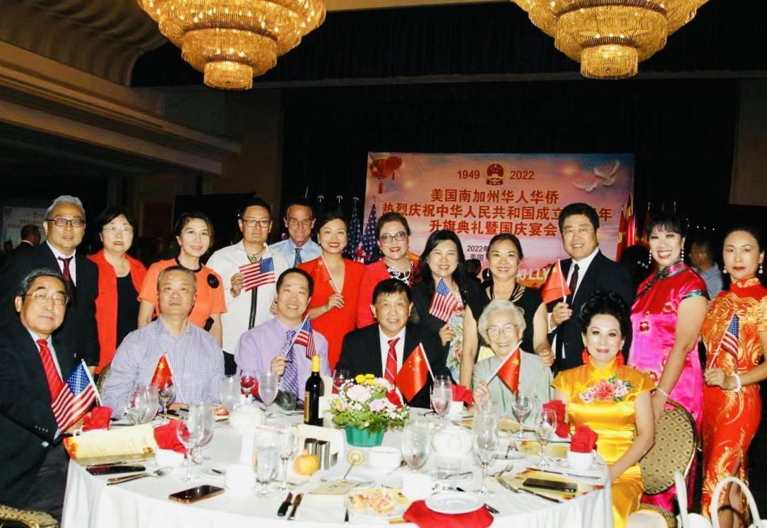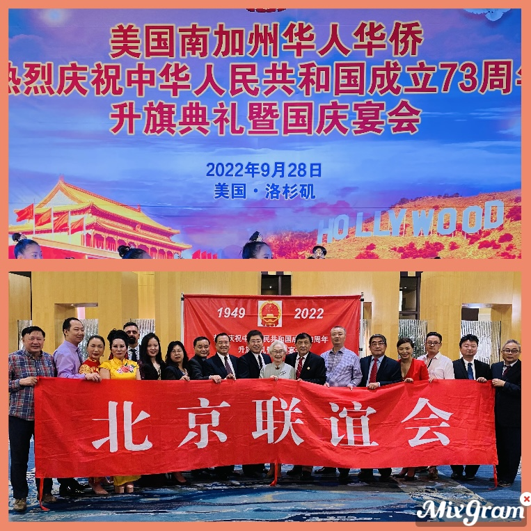 此前,美国北京联谊会会长北奥,邀请我参加2022年9月28日晚上,在洛杉矶太平洋棕榈大酒店举行的美国南加州各界华人华侨“庆祝中华人民共和国成立73周年升旗典礼暨国庆宴会”,我特别感谢北奥会长并请他绕路捎带一下,他回复“OK!”无巧不成书,我已报名参加美中文化协会创会会长、美中文化协会基金会会长林旭组织的《北加州探寻华人先辈淘金修铁路之旅》,有几个问题需要请教,正好大名鼎鼎的加州旭哥要去布置大会现场,他提前出发绕路来接我。担任国庆宴会组委会荣誉主席的人仍是德高望重的张素九大姐大,总指挥鹿强,总协调杨辉。由美国南加州华人华侨联合总会、美国南加州华人社团大联盟、美国南加州华人社团联合会、美国南加州高校联盟、世界越柬寮华人社团联合会、美国南加州华人联合总会、美国南加州促统论坛、美国华人协会南加州分会等社团主办。大会分三篇进行,第一篇,庄严的时刻:演唱美国国歌、升美国国旗,演唱中国国歌、升中国国旗。第二篇,嘉宾致辞:美国著名侨领张素久代表全体华人华侨致词,中华人民共和国驻洛杉矶总领事馆张平总领事致词,美国南加州华人华侨联合总会会长蔡成华代表组委会致辞,美国南加州华人社团大联盟主席林淦花代表组委会致答谢词,大会主席陈惠碧、李宏良、张鸣、邵闻、邹德昭、关键荣等致词,民选官员颁发贺状。第三篇,欢庆歌舞:女声独唱《今天是你的生日》《国歌响起》,旗袍秀《雅韵流欢》,舞蹈《祝福祖国》,男女声二重唱《我和我的祖国》,街舞《破风》,舞蹈《花木兰》,傣族舞蹈《欢庆的日子》,男声独唱《东方有一个梦》《大江南》。当演唱中国国歌《义勇军进行曲》和《歌唱祖国》的时候,800多名来宾,放开嗓子纵情高歌,全场爆发了排山倒海一般的爱国情绪,震撼力极其强烈,很多人的眼睛里饱含着泪花。其实,举办升旗典礼暨国庆宴会,就足以表达南加州华人华侨一片爱国之心,既可以增强中美人民之间的友谊,也能够衷心祝福伟大祖国繁荣昌盛,人民幸福安康!