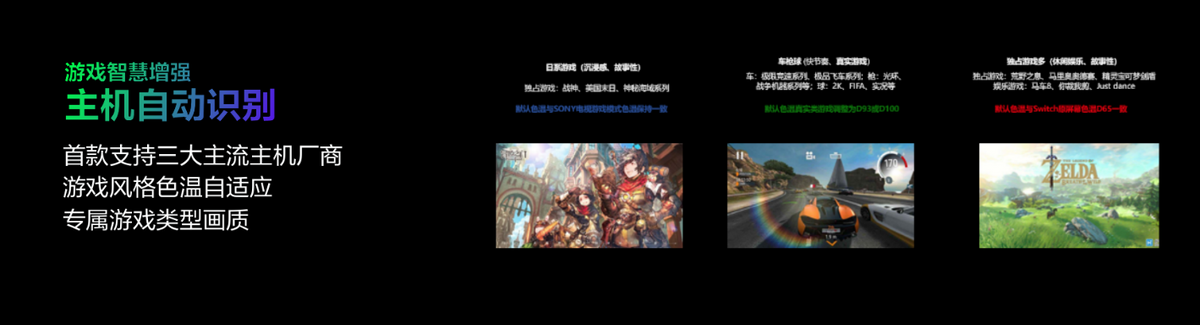 除了好基础硬件能保证游戏画质栩栩如生,华为Vision智慧屏 Z 电竞版为游戏玩家进行专属的游戏画质智慧增强模式,让游戏画质更智能,打造自己专属的游戏画质。它是业界业界首个支持主流三大主机游戏厂商的智慧屏,能够自动识别游戏主机类型,并根据游戏类型,自动调整色温,让画质显示更符合游戏表达,自动开启低延时模式,让游戏不卡顿。比如在连接Switch时,它能自动将色温调整为与Switch原屏幕色温D65一致。同时,它也支持用户对画质参数进行自定义,以获取最适合自己的游戏画面效果。