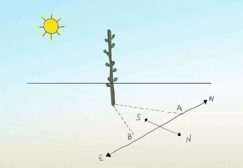 俗话说:“立竿见影”,用一根棍子,将其立在地面,把一块石子放在它影子的顶点A处;约10分钟,影子的顶点移动到B处时再放一块石子,将A、B两点连成一条直线。这条直线的指向是东西方向,与AB线垂直的方向则是南北方向,向太阳的一端是南方,相反方向是北方。