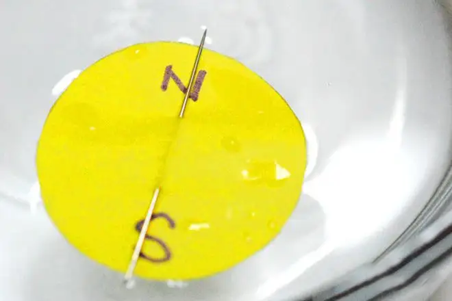 将铁丝、针反复在磁铁、衣物、头发等能产生磁性的地方摩擦,让铁丝或针产生磁性后,将其放在叶子、纸片、泡沫等漂浮物上,再放入水中。等针停止旋转时,指针将会受到地球磁场影响,方向始终指向南北。