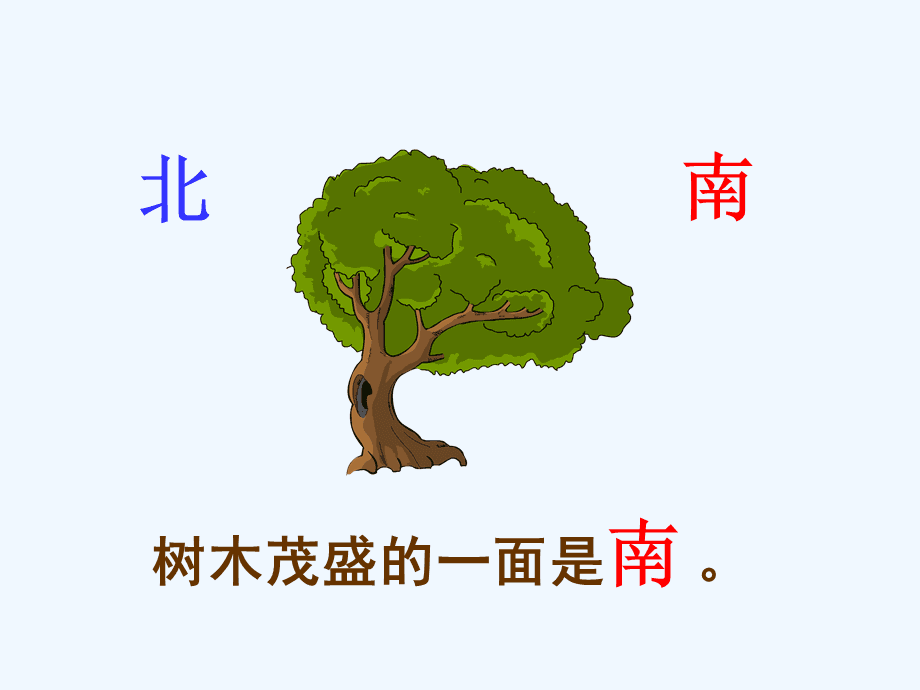 年轮:树木随着不断生长,会产生年轮;观察树的年轮,朝南的一半年轮较为稀疏,朝北的一半较密。