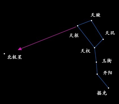 首先找到比较好辨认的像勺子的北斗七星,以勺口上两颗星(天璇星和天枢星)的间隔延长5倍,就能在此直线上找到北极星,北极星所在的方向就是正北方。