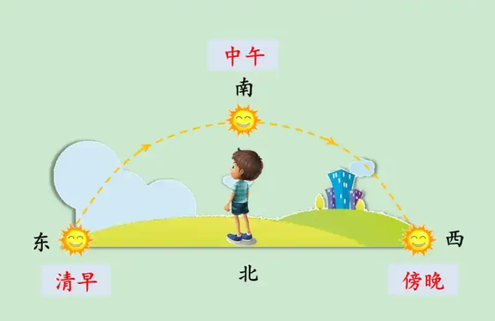 我们可以用太阳做参照物,太阳东升西落,我们可以根据它的升落来辨别基础的方向。