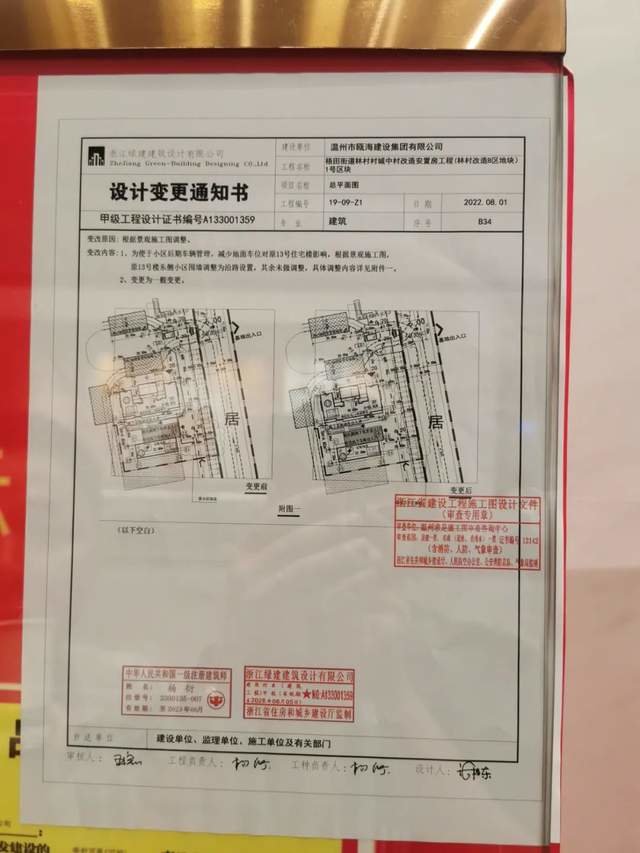 3、现场已建围墙与售楼处围墙设计变更通知书的公示相同,等于开发商已经承认沙盘被改的事实,而且“2022 年 8 月 1 日设计变更通知”未经资规局备案审批盖章,只是作为一般通知收件,这一点我们业主是不认可,有异议的;