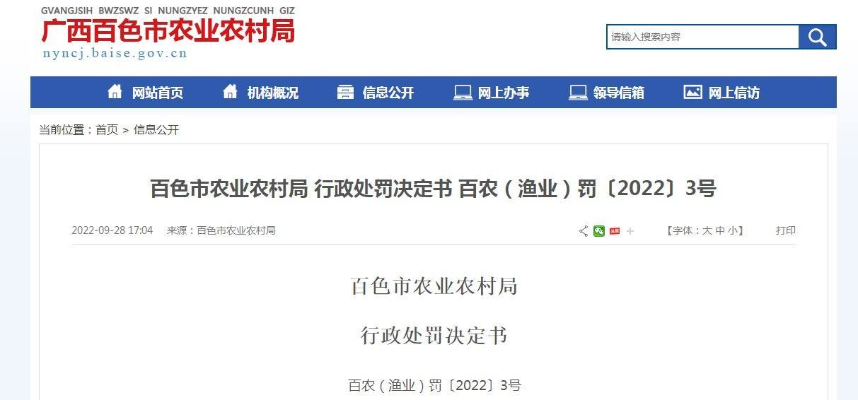 9月28日,广西百色市农业农村局官网发布行政处罚决定书。