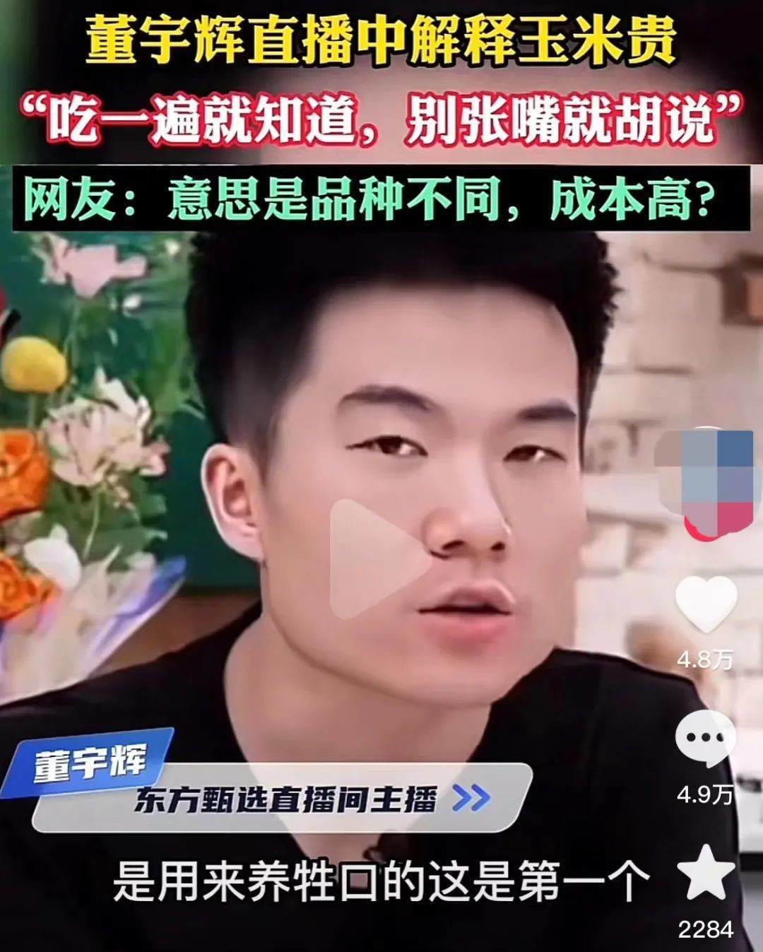 东方甄选阵营中,有人用市场经济理论论证中间商赚差价的合理性、有人现身说法成很多廉价玉米就是喂牲口的,有人抨击生产商东北农嫂见利忘义背刺插刀捡了芝麻丢了西瓜。