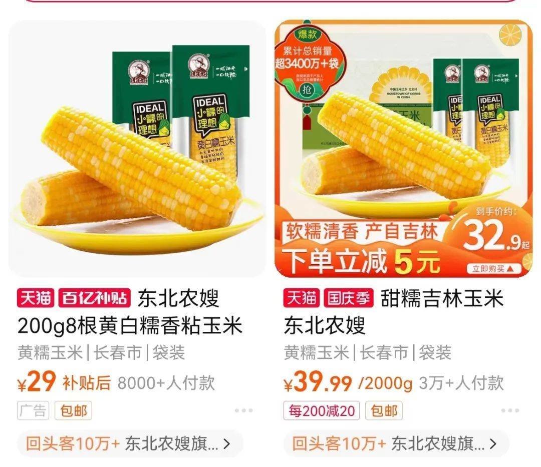 3、鲜食玉米的生产流通有三个关键节点:农民生产种植、厂家地头收购深加工(销售)、渠道分销商卖货。所以那根引发舆论大战的玉米每卖出一根,差不多是农民拿到8毛,东北农嫂自营的话,参考旗舰店热销第2(第一已经下架,不知道是否就是东方甄选同款)8根券后约33元的价格,每卖掉一根大概拿到3.2元,考虑到东北农嫂需要收购、加工、承担销售、库存、售后成本,这个“差价”大家应该是都能接受的。