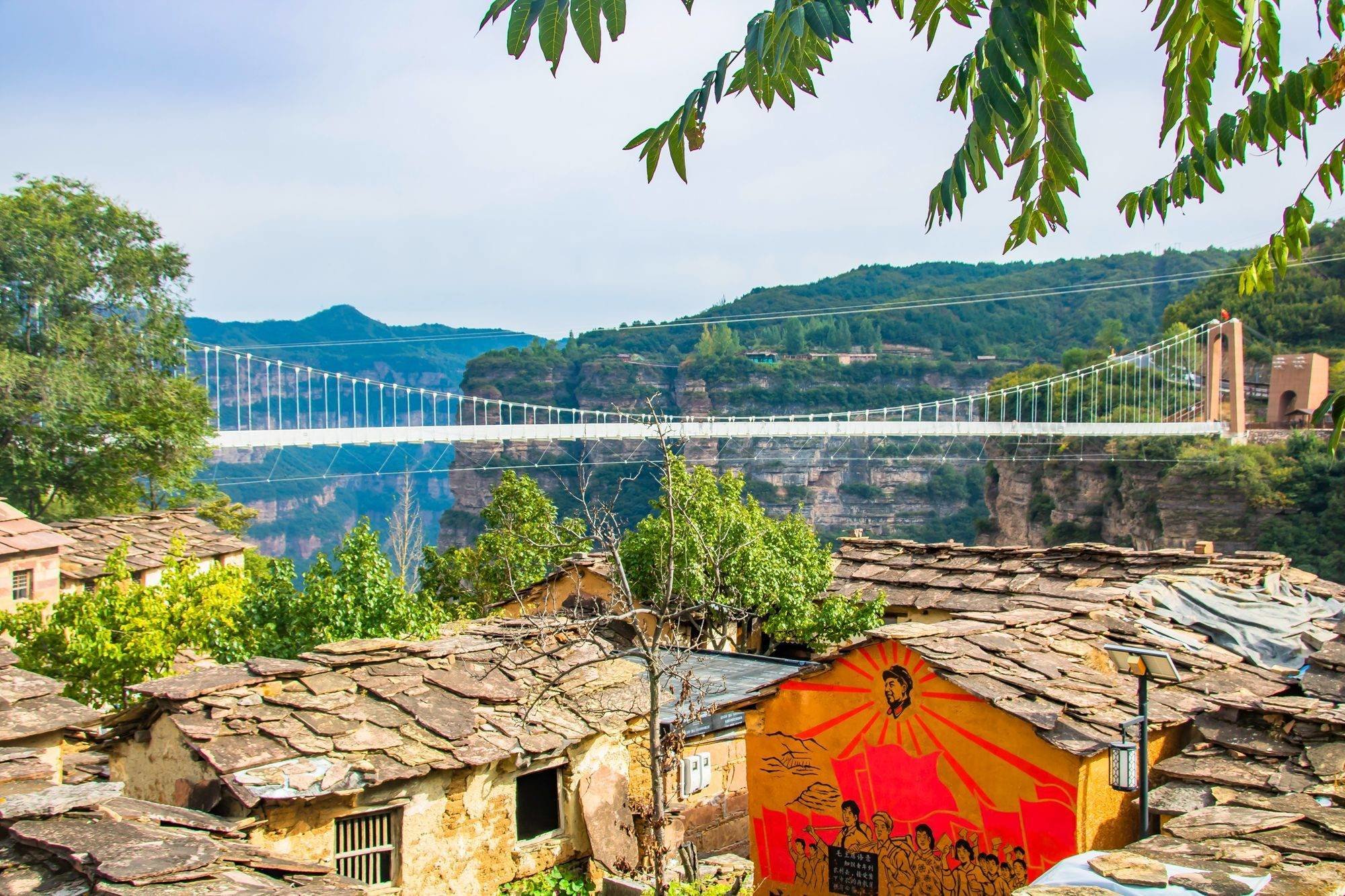 房舍墙壁上的画带着浓厚的时代气息,和不远处跨在两山之间的玻璃吊桥形成鲜明对比,近在咫尺却又仿佛存在于两个年代之中。