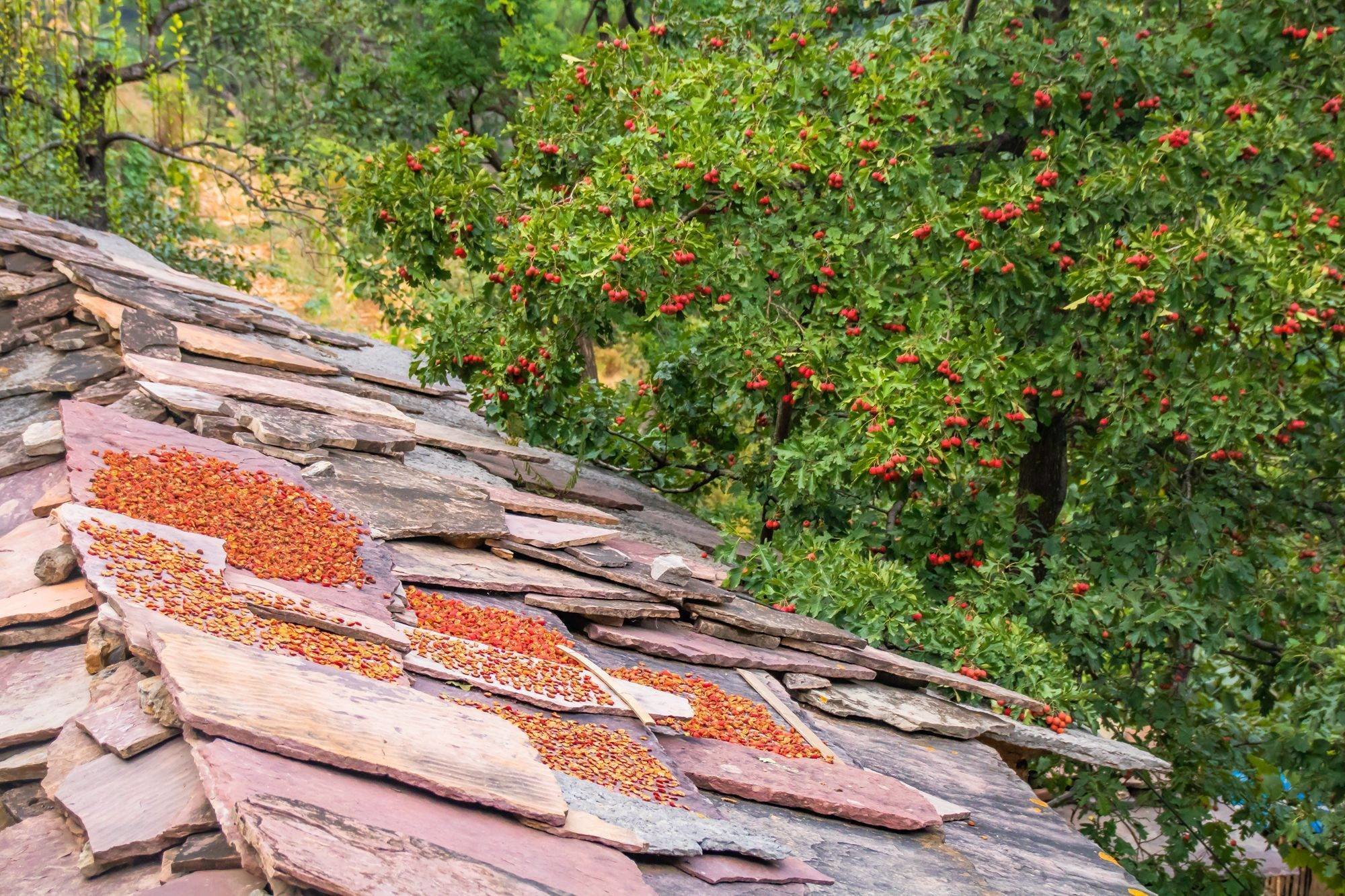 成片成片的山楂干静静躺在屋顶石板上,在阳光照耀下显得红艳艳,演绎出“疑似崖上飞云霞,太行人家晒山楂”的绝佳胜景。