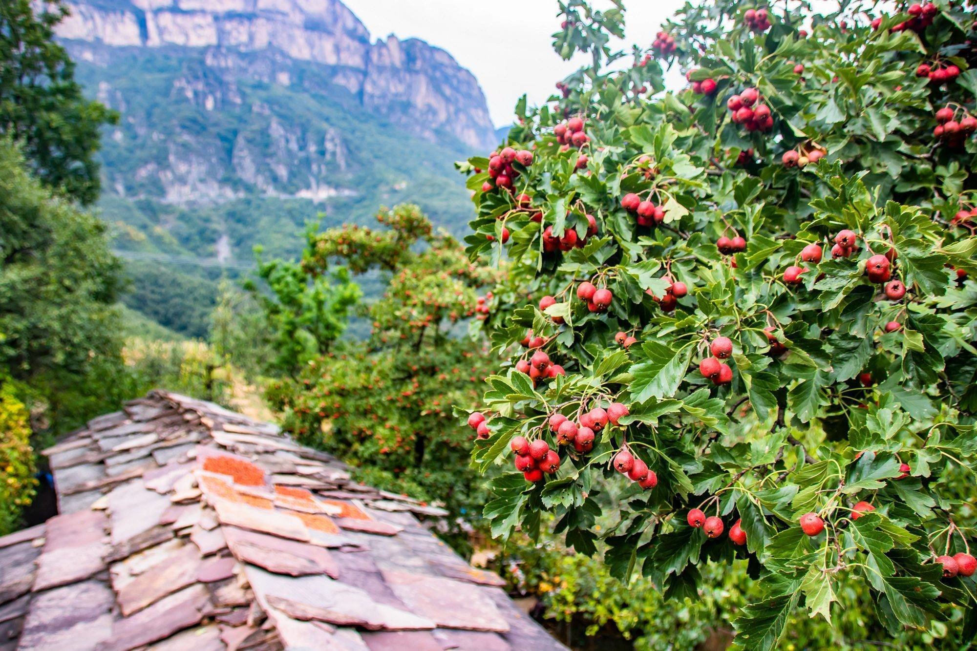 山中的山楂树硕果累累,红色果实一簇簇垂挂在绿色枝头上,让空气中都充满了酸酸甜甜的味道。