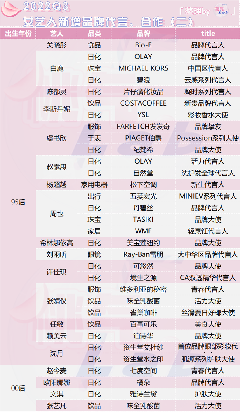 再以白鹿为例,目前她的常驻综艺《跑男》在播,新剧《宁安如梦》刚杀青。她也从OLAY品牌大使升级为面部护理品牌代言人、MICHAEL KORS中国区珠宝腕表代言人升级中国区代言人、新增宝洁碧浪云感系列代言人。2022年白鹿新增代言超15个,称得上她的爆发年。