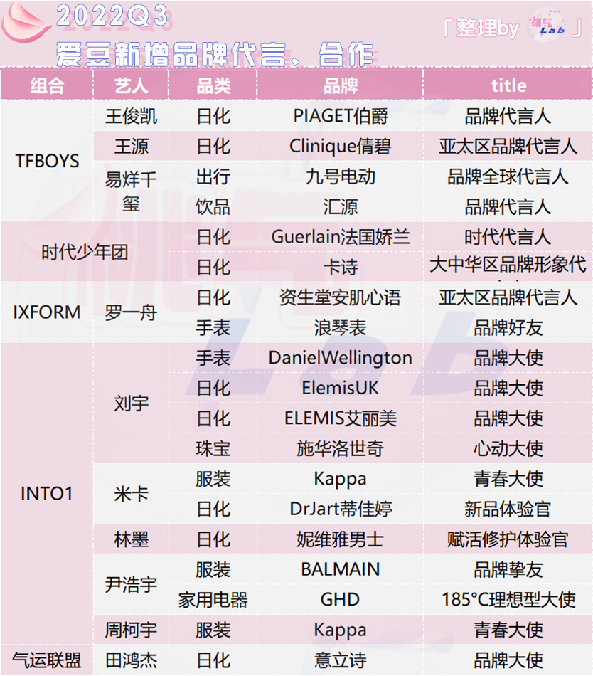 时代峰峻旗下的二代团——时代少年团,上半年成为康师傅冰红茶品牌代言人、伊利优酸乳品牌代言人和路易威登品牌大使。Q3新增了2个,分别是卡诗和大中华区品牌形象代言人和Guerlain法国娇兰时代代言人,目前以团资为主。
