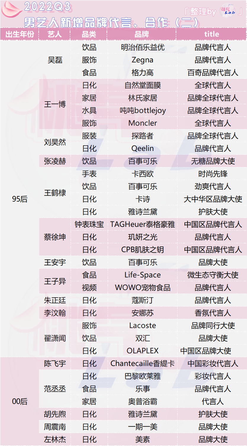 蔡徐坤深受品牌的青睐,新增了3个代言,一口气成为了泰格豪雅中国区品牌代言人、玑妍之光品牌代言人、CPB肌肤之钥中国区品牌代言人。此外,凭借剧综或音乐等领域的强曝光,王子异、朱正廷、李汶翰、周震南、翟潇闻、刘也、左林杰等人,也握有新代言。