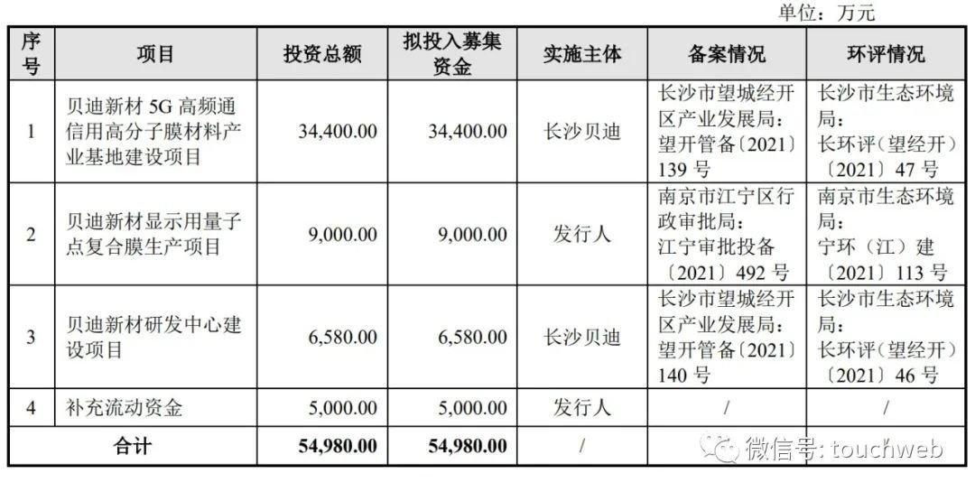 贝迪新材曾计划募资5.5亿,其中,3.44亿用于贝迪新材5G高频通信用高分子膜材料产业基地建设项目,9000万用于贝迪新材显示用量子点复合膜生产项目,6580万用于贝迪新材研发中心建设项目,5000万用于补充流动资金。