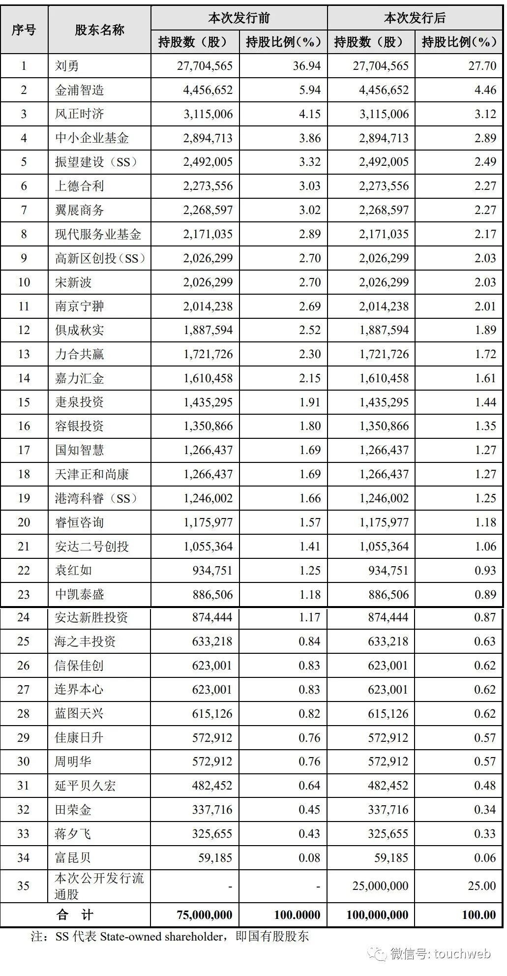 IPO后,刘勇持股为27.7%,金浦智造持股为4.46%,风正时济持股为3.12%,中小企业基金持股为2.89%,振望建设(SS)持股为2.49%;