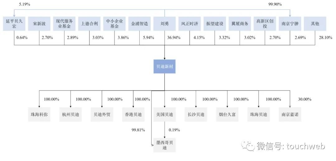 IPO前,刘勇直接持有贝迪新材36.94%的股份,通过南京宁翀控制贝迪新材2.69%股份,通过延平贝久宏控制贝迪新材0.64%的股份,合计控制贝迪新材40.27%股份,为公司控股股东及实际控制人。