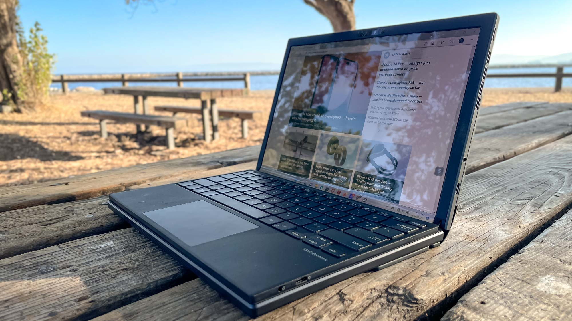 不过不少折叠屏手机的用户可能会发出疑问:折叠屏最重要的是生态,这方面华硕这款电脑做得如何?得益于Windows天生的窗口化机制,这台电脑内置的Win11在分屏和小窗方面的表现相当理想。并且近期Win11 22H2的更新也着重适配了这一点。但最为特别的是,华硕本身也为折叠屏生态做了充分的准备工作:将键盘放置在下半部分的屏幕上,电脑会自动将所有显示内容集中展现在上半部分,此时与常规的笔记本无异,而取下键盘即可恢复全屏显示。