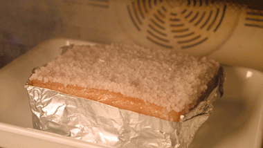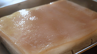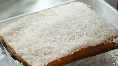8.取出,在猪皮表面刷上白醋水,再撒上0.5g左右可食用苏打粉,抹匀,最后撒上约60g的粗盐平铺均匀。