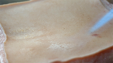 3.用插肉器或牙签在猪皮表面扎上密集的小孔。