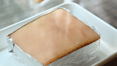 7.猪皮朝上,周围包上一层锡纸,用刀将猪皮表面多余的腌料刮去,放入冰箱冷藏6小时以上(最好隔夜冷藏)。