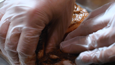 6.猪皮朝下,浸泡于白醋中10分钟,倒掉白醋,猪肉均匀涂上腌料。