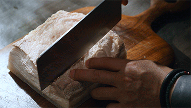 4.将猪肉切成2指宽,深度至第一层瘦肉的位置。