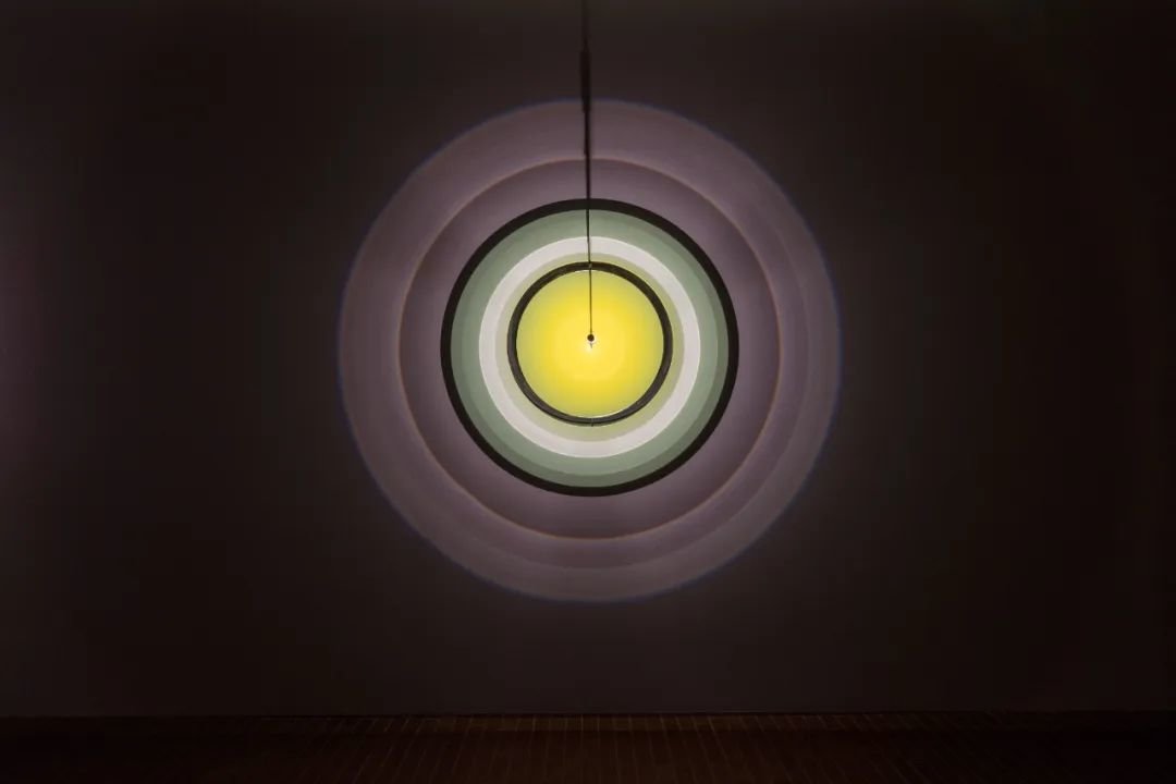 早在艺术生涯之初,奥拉维尔·埃利亚松就喜欢创作具有实验性装置功能的艺术品,展览中的《明日共鸣器》这件作品就是该思路的体现。这件光学仪器的核心部件是一个斜边玻璃环。它原本属于一套菲涅尔透镜,其用途是在灯塔中集聚发散的光束,并以一个固定的角度投射出去,从而增加光的强度。这种将光当作可延展材料来对待的能力,在此作中被用来在墙上绘制素淡的彩色条纹。