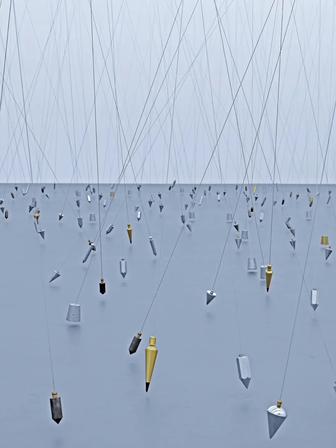 《指向无穷的750个点》由750条负重的铅线组成,所有与铅线连接的悬垂物皆指向不同的方向,似乎被多重磁场紧紧攫住。这几百条铅线似乎都指向我们脚下的地面,然而它们倾斜的轨迹很快便使人意识到了这是一次对引力定律的本质性破坏。