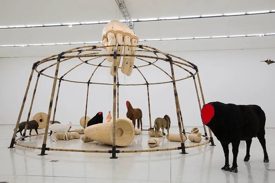 ▲ 《马戏团》,黄永砅,2012,木头、竹子、动物标本、树脂、钢、线和布,841.1×1000.1×1000.1cm,图片由红砖美术馆提供