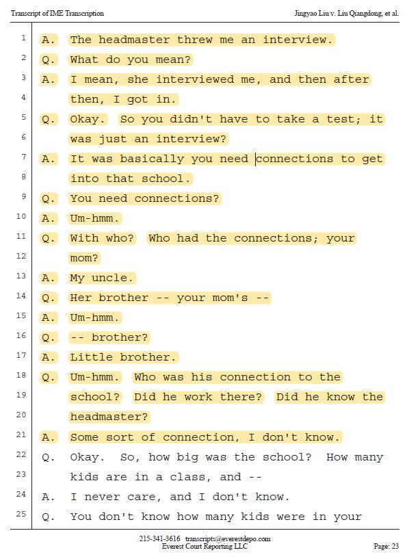 根据6月底双方提交的证据中刘婧尧所作的一份心理评估对话显示,在她小学一年级的时候,就跟随母亲从青岛到北京读书,就读的是一所北京顶级的学校,“像一个古代的皇子拥有的中国宫殿”。