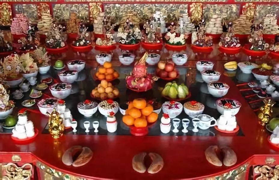 神的供品,也要依礼摆设。其排列顺序是从内到外:一茶、二果、三饭、四菜、五馒头。