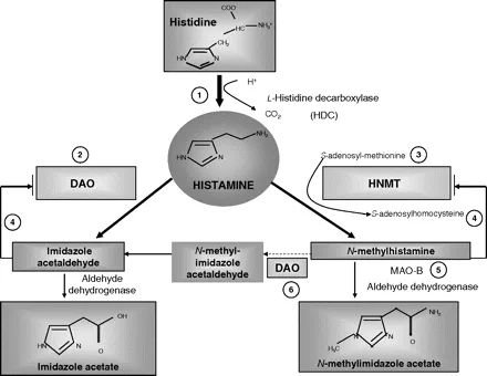 体内的组胺是一种信号分子,具有多种生理功能。组胺在细胞生长、葡萄糖代谢、趋化性和吞噬作用中起关键作用。组胺本身与过敏反应和炎症最相关。组胺是通过必需氨基酸 L-组氨酸的脱羧过程在体内合成的,该过程由一种称为组氨酸脱羧酶 (HDC) 的酶进行。[4]组胺储存在体内的多种细胞中,包括肥大细胞、嗜碱性粒细胞、胃黏膜和组胺能神经元,它们将其储存在细胞内颗粒中。还显示少量组胺在淋巴细胞和上皮细胞中合成。[5]图 1 展示了组氨酸如何代谢为组胺,其中组氨酸通过使用酶二胺氧化酶 (DAO) 和/或组胺-N-甲基转移酶 (HNMT)的两种途径分解。组胺降解的过程似乎取决于组胺在体内的位置。关于 HIT 患者,由于科学界认为 DAO 充当细胞外组胺的清除剂,因此重点主要放在 DAO 降解途径上。DAO 也仅限于身体内与胃区相关的某些组织。