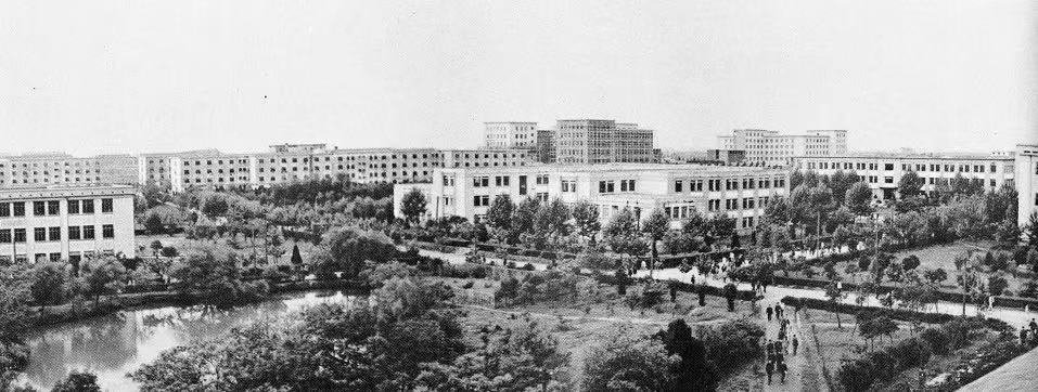 可以看到,摄于1963年的黑白照片里,主教学楼挺拔巍峨,全貌可见,楼前栽种下的树苗排列成行,枝叶未长而显稀疏;摄于2015年的彩色照片里,秋意正浓,层林尽染,楼前的树木已成林,教学楼完全掩映在枝繁叶茂之中。