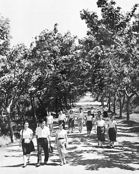 师生在校园林荫道上悠闲地散步。(1963年)校史资料