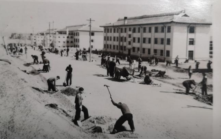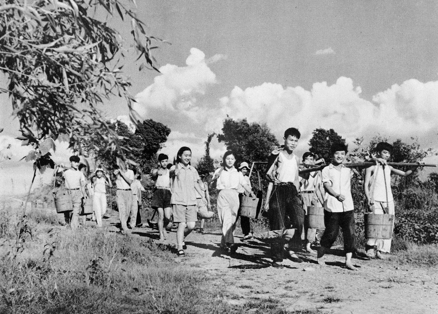 学生们分组挖树洞。(1955年)校史资料