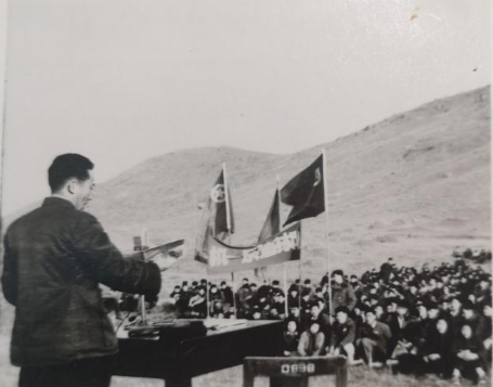 1956年,时任学校党委书记、副院长朱九思在植树典礼上讲话,照片背景为当时的喻家山。