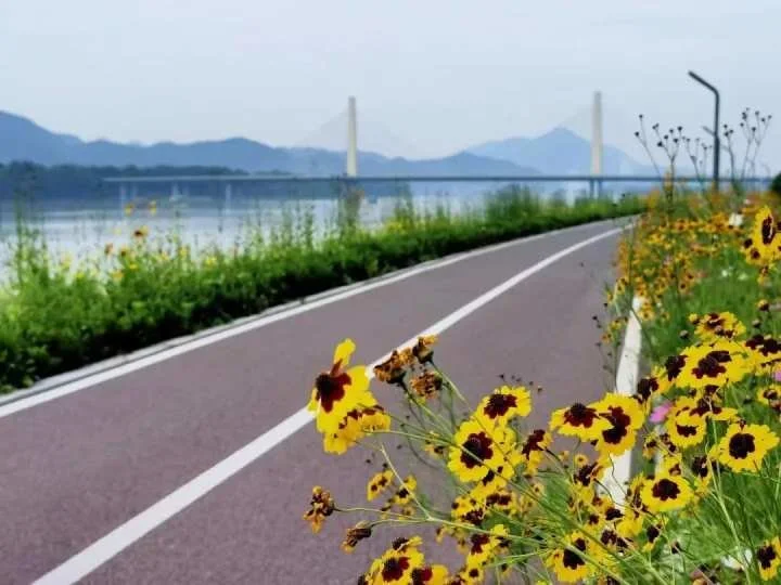 富春绿道南线位于富春江二桥至富春江三桥,全长8.2公里,平均宽6米,骑行约50分钟,是一条宝藏休闲绿道。自行车道坡道平缓,适合不同年龄人群骑行放松。路面采用彩色沥青铺设,更加平稳、顺畅。