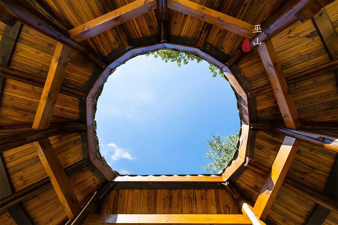 尤其这个凉亭造型相当特别,从凉亭仰望天空,湛蓝一片沁人心脾。