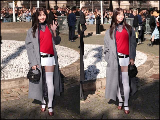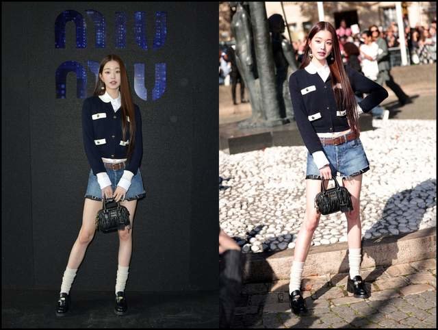 张元英的搭配要显得“聪明”很多,没有选择秀场上的各种低腰裙的组合,而是穿了一套适合自己气质甜妹look,鞋袜的搭配也更显比例。