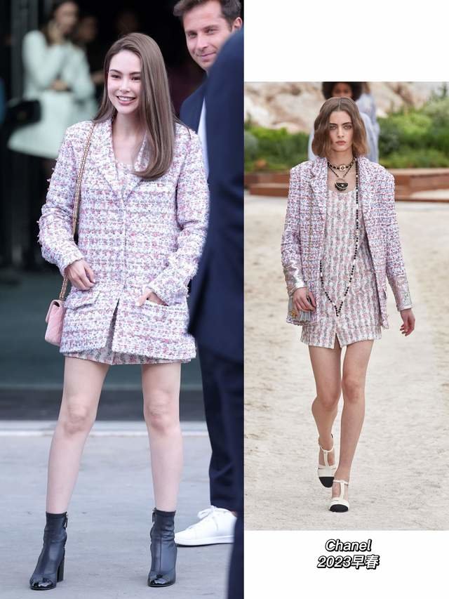 生完三胎才没多久的昆凌这次也惊喜亮相巴黎香奈儿大秀。选了一套来自香奈儿2023早春度假系列的粉紫色系的粗呢套装,就是非常乖巧甜美的贵娇妻风格。