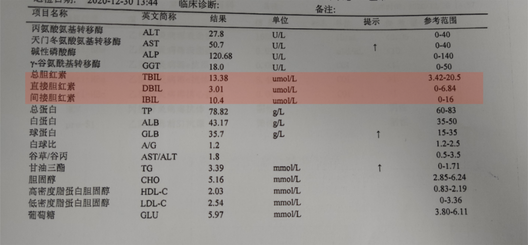 正常值:总胆红素:1.7~17.1μmol/L;直接胆红素:0~3.42μmol/L;间接胆红素:1.7~13.68μmol/L。