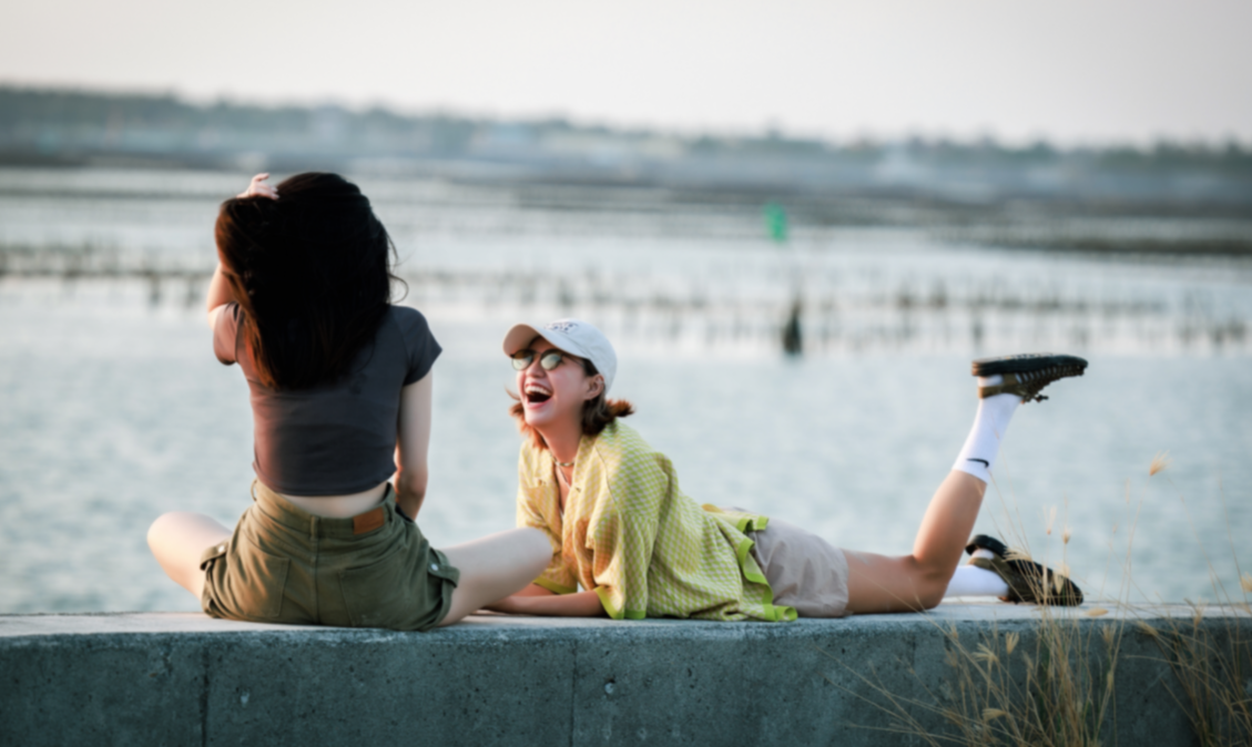 不难看出焦曼婷私下拍照很喜欢大笑,在这张湖边趴在地上的抓拍照中,焦曼婷即便戴着墨镜却难掩好姿色,皮肤白皙笑起来十分有感染力,单腿翘起姿势稍显一丝调皮,搭配身旁美女的背影,氛围感简直拉满。