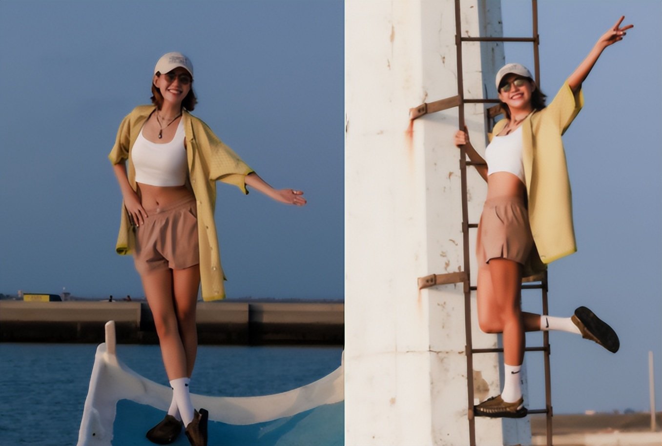 今年27岁的焦曼婷身上似乎还有着少女般的灵动,在拍照时动作都很古灵精怪,只见她单手叉腰双腿踮起,动作搞笑却又很假小子。在楼梯上抬腿比耶的姿势更是活力满满,一双大长腿十分吸睛,内搭小吊带炫出一截平坦小腹,不仅颜值出众身材也苗条。