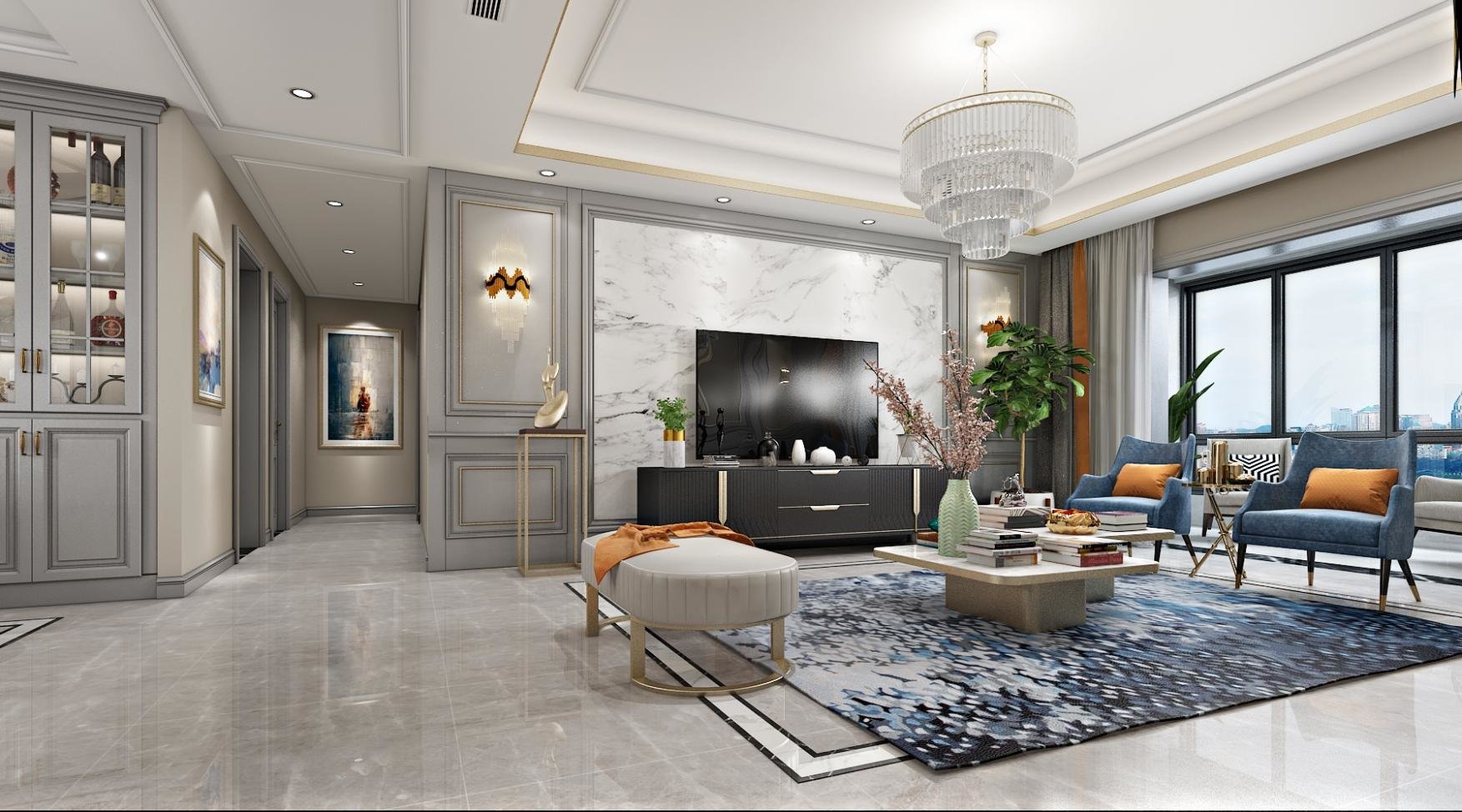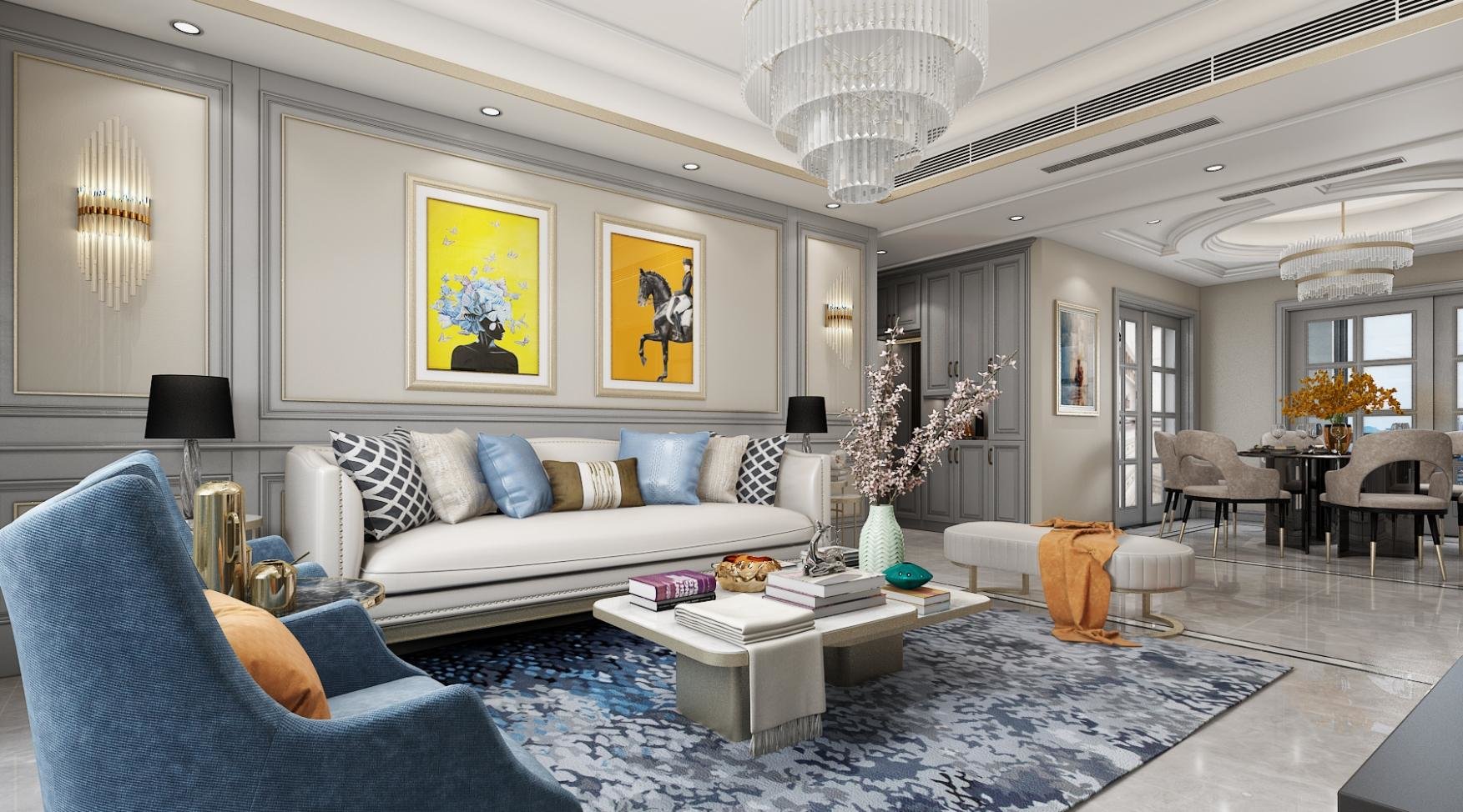 客厅整体的空间给人一种温和柔美的感觉,温馨米灰色的造型背景墙设计,背景墙上的线条有着清爽明快的效果,墙上颜色亮丽的装饰画点亮空间色调,简单的沙发+茶几设计,配上不同色调的抱枕让人感觉很舒服,使用大型吊灯减少客厅空旷感。