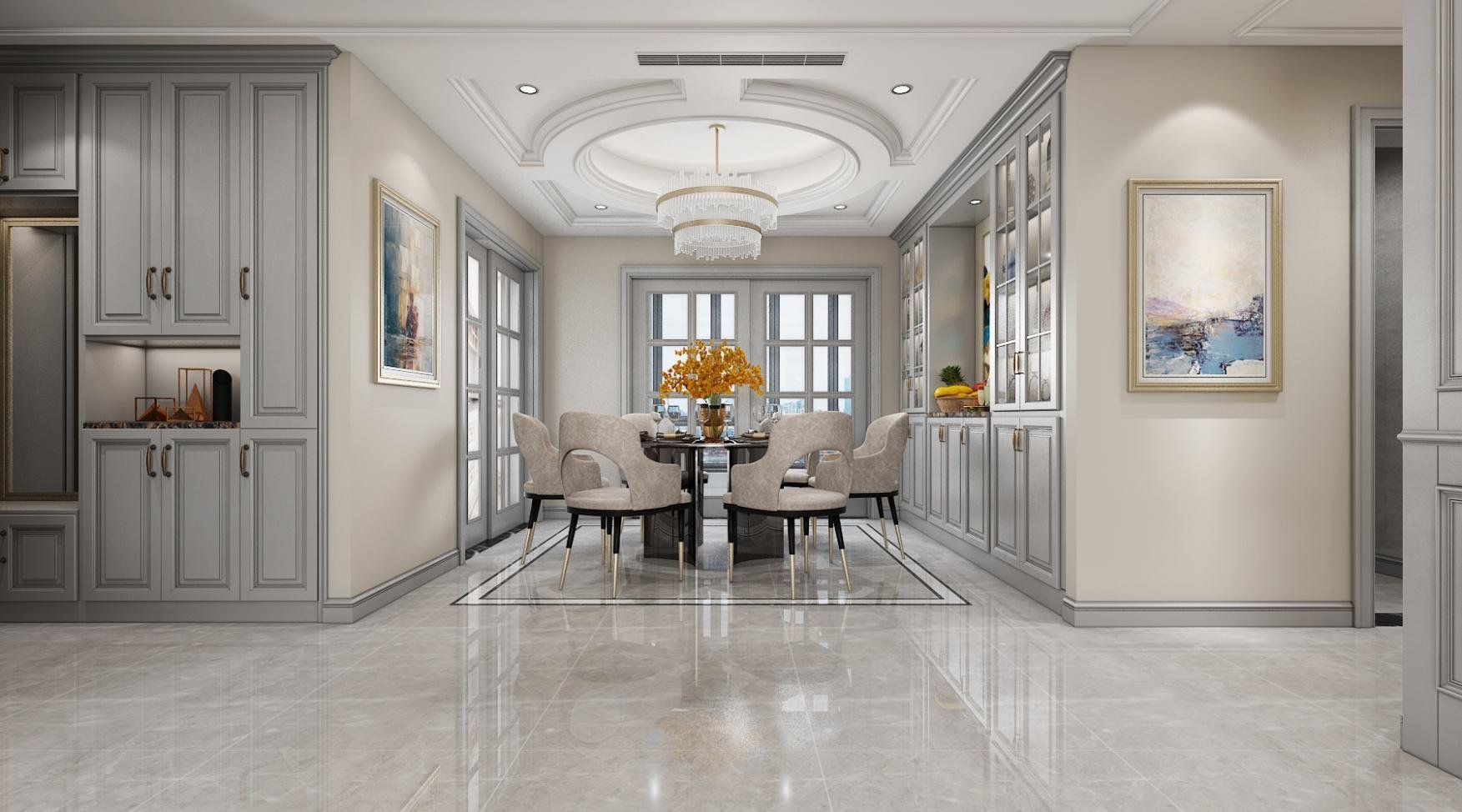 在餐厅设计中灰色和白色相呼应,再加上华美的灯饰相结合在一起,有一种奢华感,在这里吃饭是一种享受。