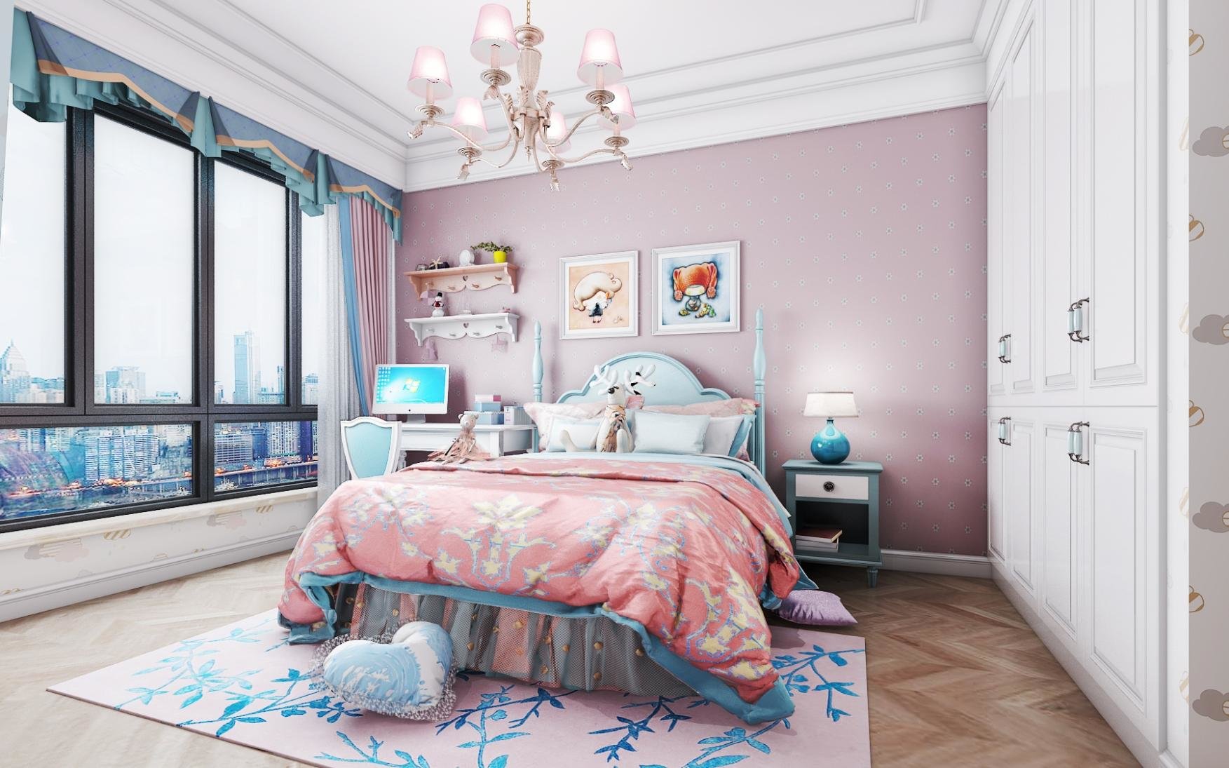 这个粉色的儿童房是小公主的乐园,有一种简洁,大气的感觉,纯白的衣柜,粉色的背景墙和软装给人一种童话世界的感觉。