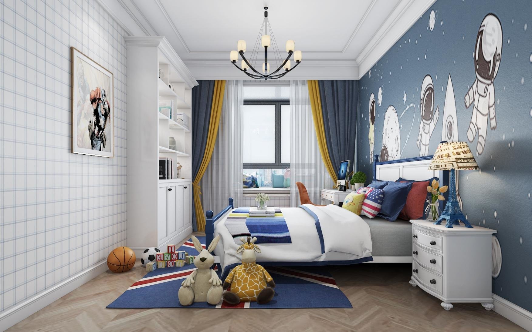 男孩房则童趣很多,蓝色卡通的宇航员背景墙引导孩子探索太空的奥秘,蓝白二色在这个空间完美融合。