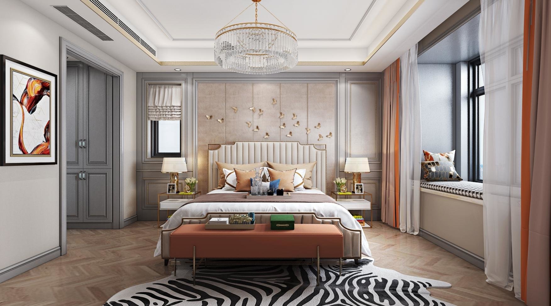 卧室是温馨、宁静,让我们没有压力可以轻松入睡,加入一抹橙色打造轻奢的感觉。