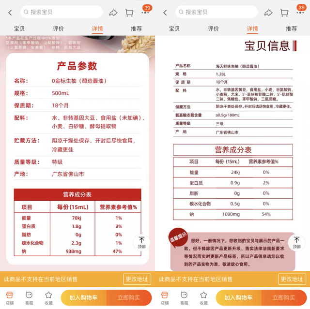 除了配料表不同,两款海天酱油在价格上也有略微差异,保质期等方面则相同。